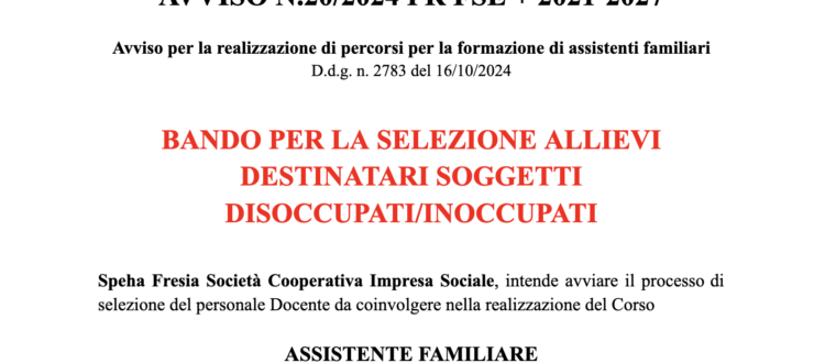 Speha Fresia Società Cooperativa Impresa Sociale, intende avviare il processo di selezione del personale Docente da coinvolgere nella realizzazione del Corso