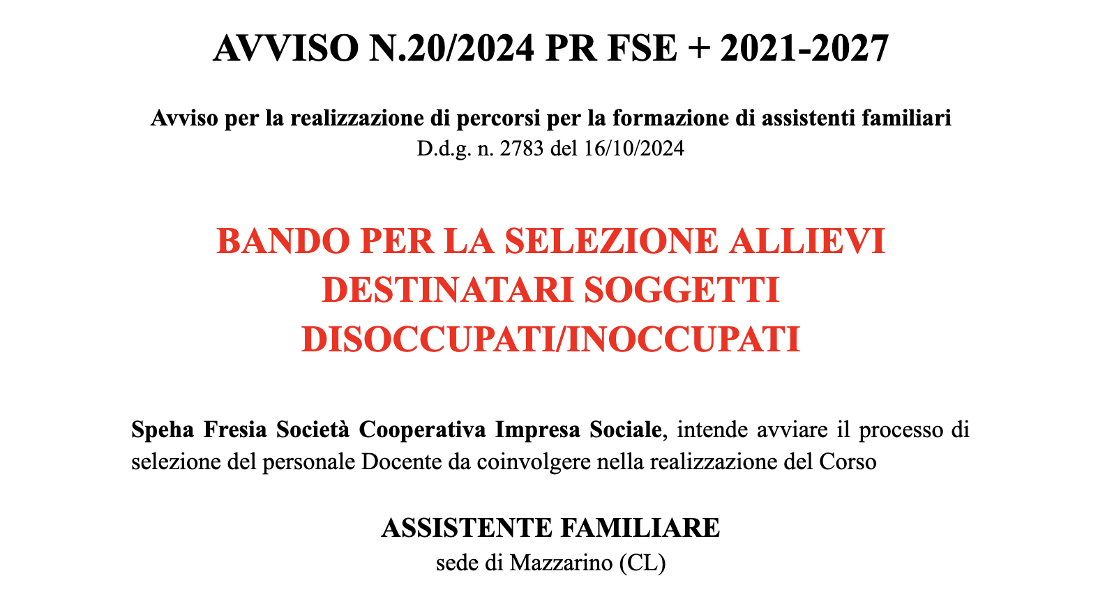 BANDO ALLIEVI Assistente Familiare | Avviso 20/2024 – Mazzarino (CL)