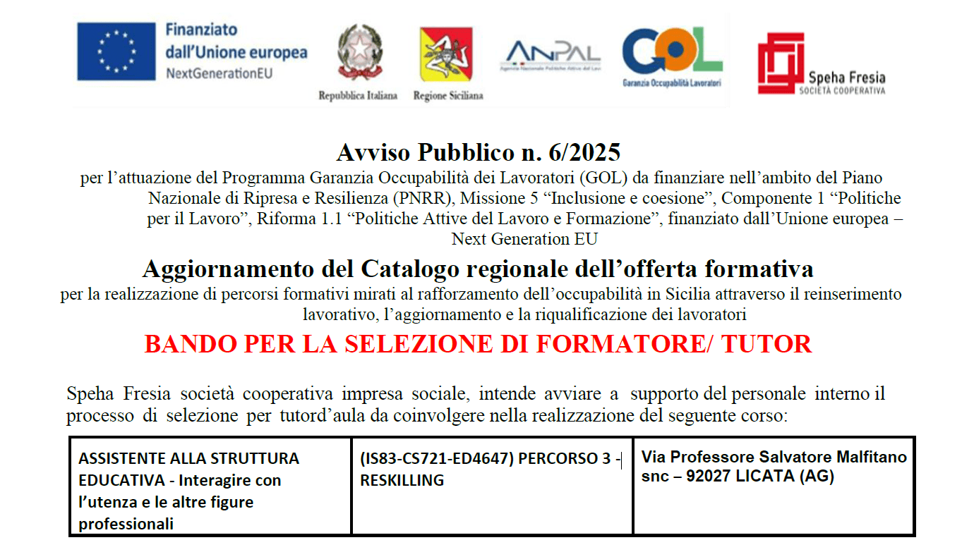 BANDO PER LA SELEZIONE DI FORMATORE/TUTOR – Licata (AG)