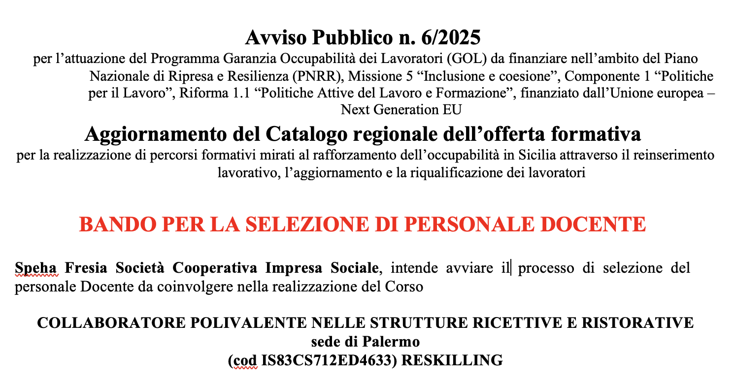 Speha Fresia Società Cooperativa Impresa Sociale, intende avviare il processo di selezione del personale Docente da coinvolgere nella realizzazione del Corso