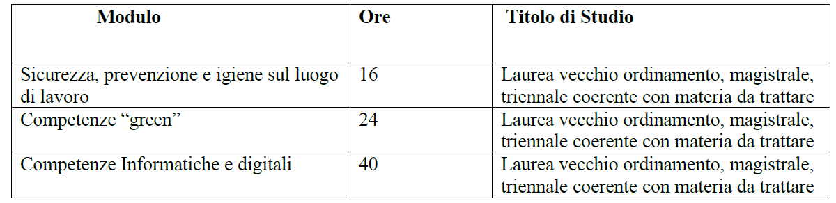 Profili Professionali ricercati: I profili professionali ricercati dovranno essere coerenti con i seguenti moduli formativi ed i titoli di studio richiesti