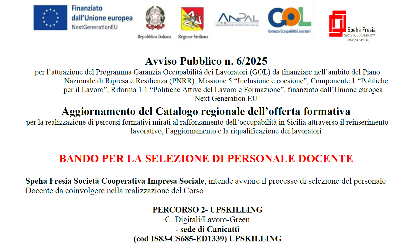 il presente bando per l’individuazione di personale docente da impiegare nella gestione didattica del corso PERCORSO 2 – UPSKILLING C_Digitali/Lavoro-Green (cod IS83-CS685-ED1339) inserito nel Catalogo dell’Offerta formativa dell’Avviso 6/25
